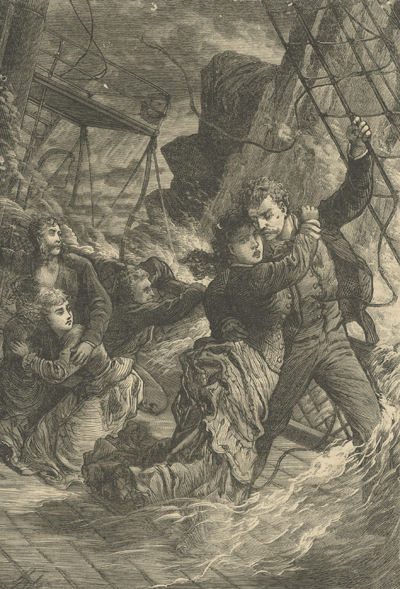 On the following morning I found seasickness in full bloom in the steerage. The misery was naturally greatest among the women; the men generally held out well. The children, of whom we had a great number on board… naturally had to suffer a good deal during their mothers’ sickness. Meanwhile the wind became even stronger during the day and stormy around evening. Dutch fishing vessels came close to us. They were tossed about like nutshells, one minute disappearing and the next minute appearing again on the crest of the waves. Our ship made heavy weather of it too. Night fell and it got very dark. All around was black; one saw only the white foamy crests of the high waves ever rolling on towards us, while heavy rain gusts fell from time to time…