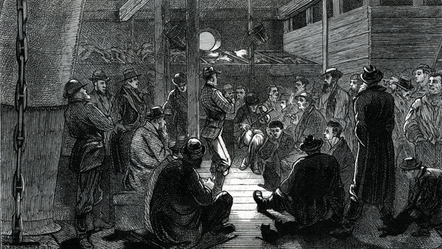 Forward between decks were the quarters of the bachelor emigrants. Here a tall thin sinewy Irishman was dancing a jig to the tune of a violin, the scraping of which combined, with the mewing of a litter of black kittens, and the laughter of the audience, to make a Babel of discordant sounds. The berths in this department were placed in a double row, with a zinc pail, and at times a looking-glass at the head of each. (The Graphic, June 29, 1872)