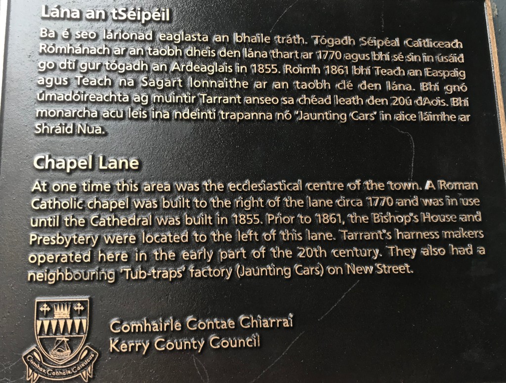 Recently, on a brief visit to Killarney with my friend, Simon More, we found Chapel Lane and wandered along it. We entered under an arch from a bigger road called New Street near the city centre of Killarney. It is narrow and a bit dingy, with other lanes crossing at right angles, leading to High Street, a much bigger street that runs parallel to Chapel Lane just a block away. A brass plaque on the wall at the entry to the lane speaks of its history, but these days it is an insignificant little side alley, with a cafe, a gym and a beauty parlour, scattered along a row of non-descriptive houses of indeterminate age, but almost certainly not dating as far back as the 1870s. I had a distinct feeling that the Chapel Lane where the Byrne family lived, has disappeared into the dust of time, and wondered if any of the buildings in the lane dated more than a few generations back. I suspect not.