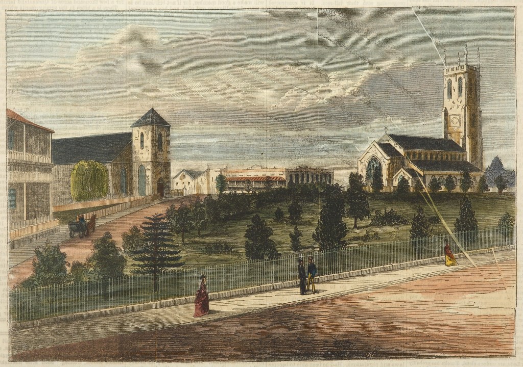 Church Hill 1870. Scots Church to the left (now demolished) and St Phillips Church of England to the right. The road beyond these churches (Clarence Street) is now lined with much higher skyscrapers. Crescent Street was off the right off this picture sloping down to Kent Street. Beyond is Barangaroo and Darling Harbour. Lang Park is in the foreground.